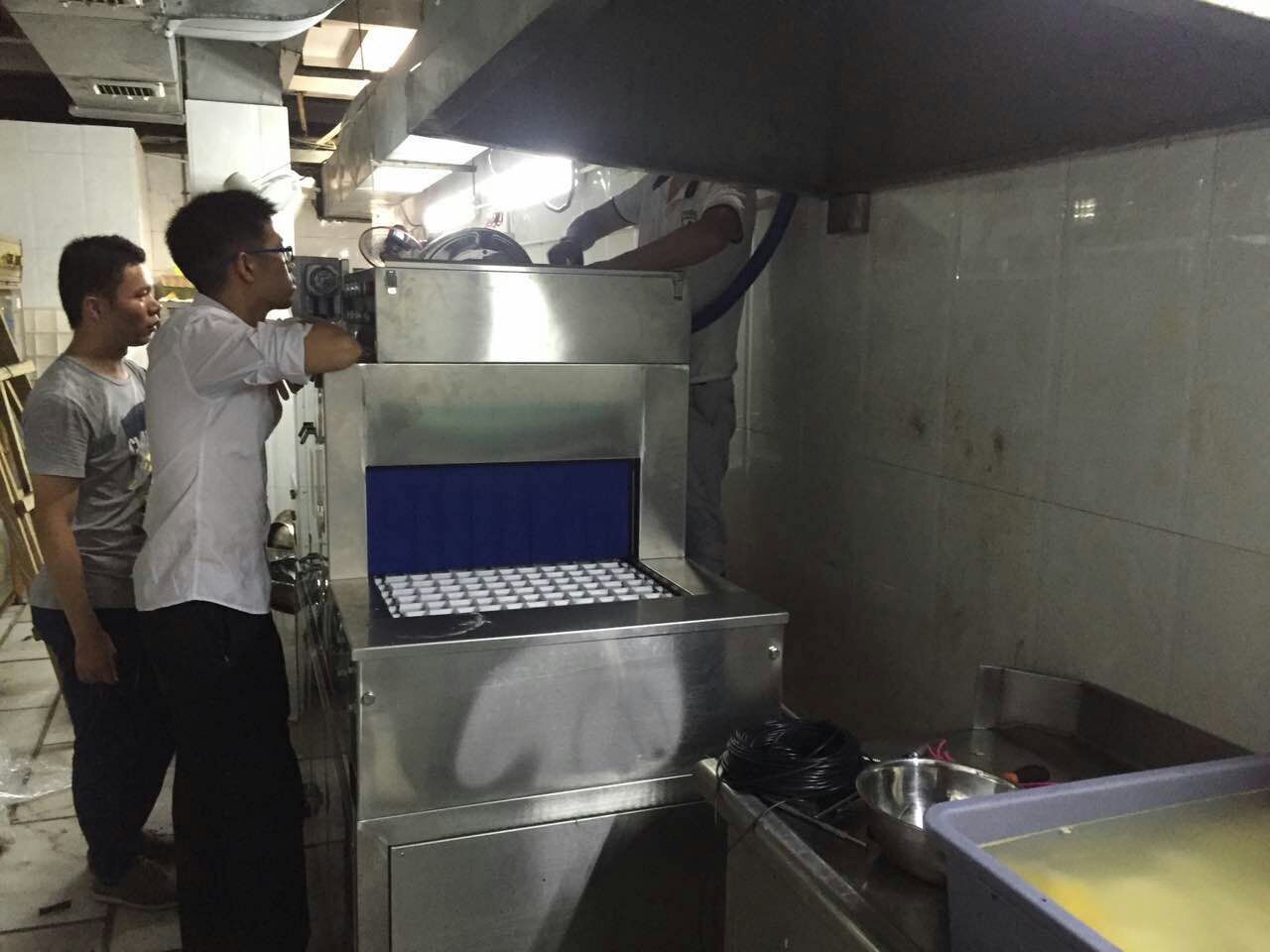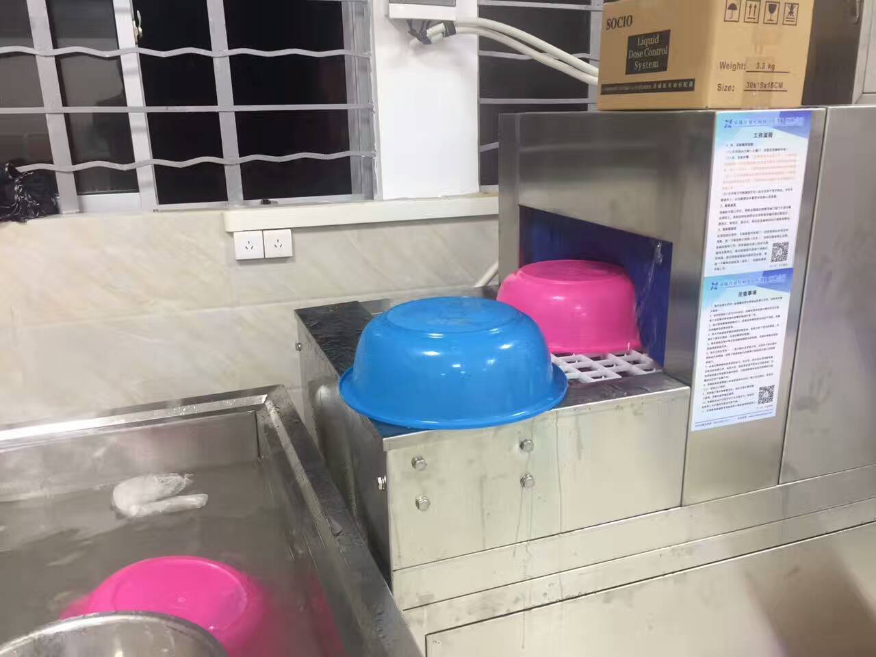 (3)沖刷:此過程適用于使用洗碗筐的商用揭蓋機和通道機,一般在進洗碗機前位置會安裝一個花灑,可沖去預洗帶的洗潔精泡沫,可伸縮式花灑更好,便于清洗洗碗機內部。