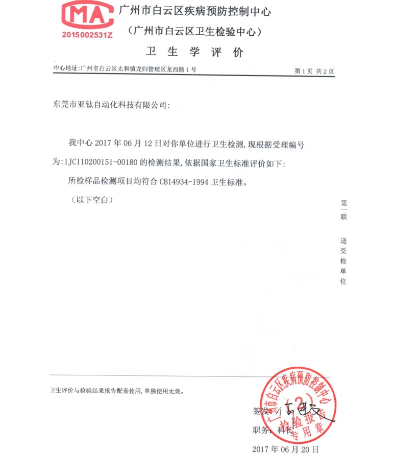 恭喜亞鈦自動化通過廣州市疾病預防控制中心檢驗