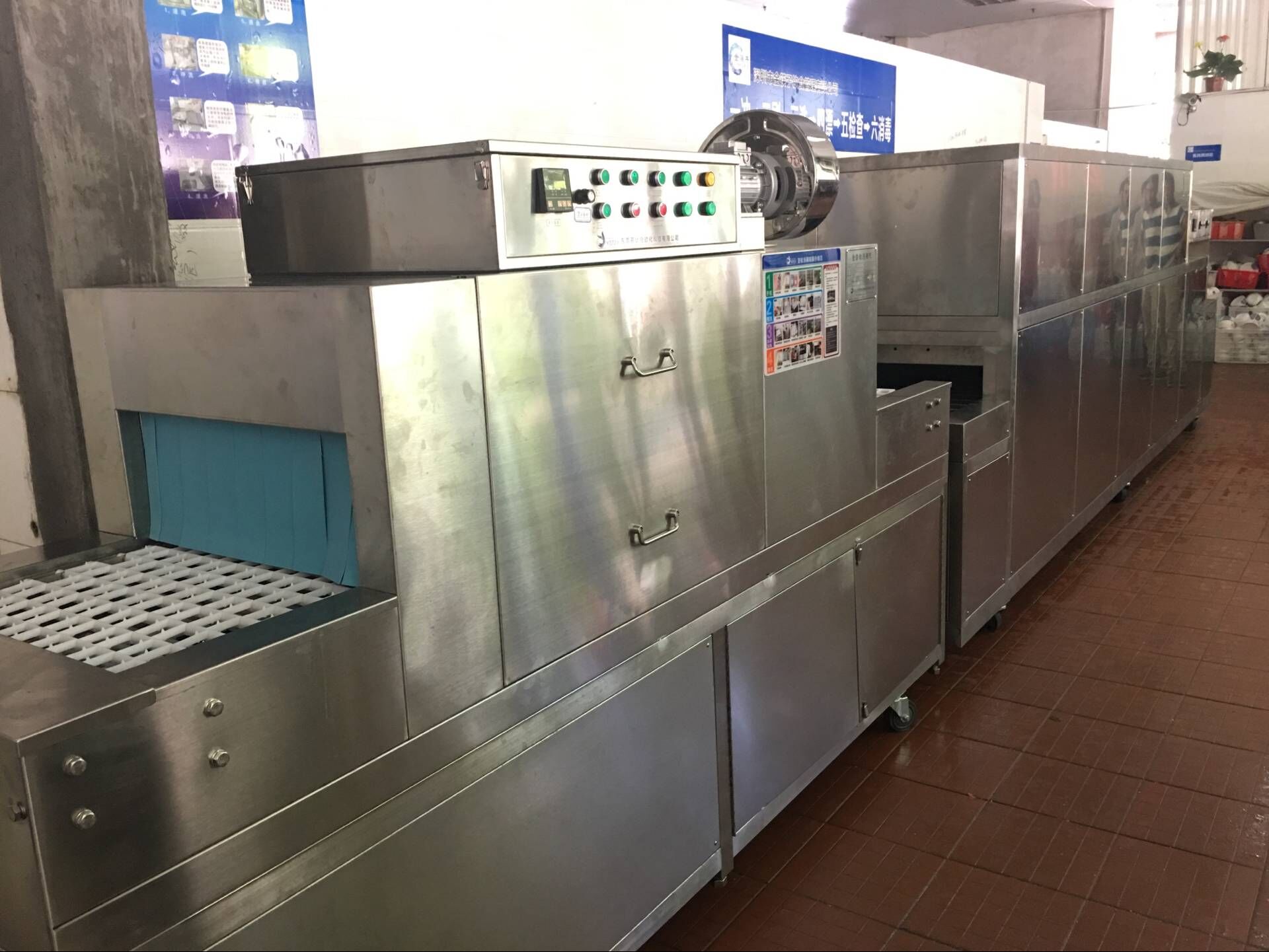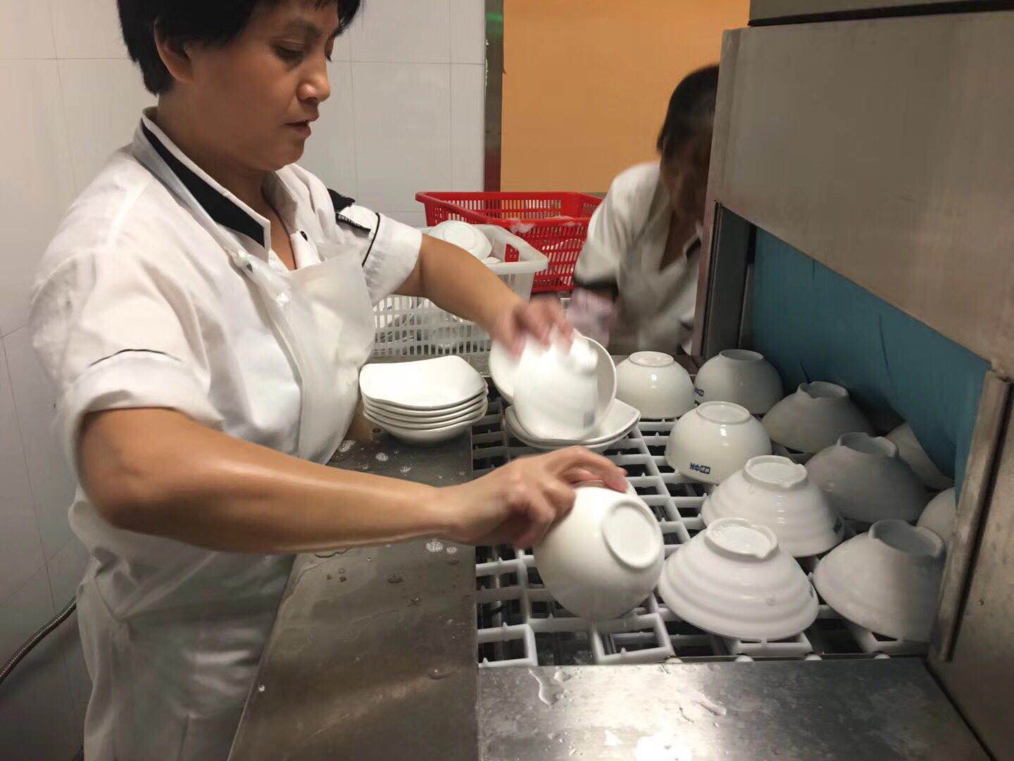3, 洗消:將餐具裝框,推進洗碗機清潔和消毒。
