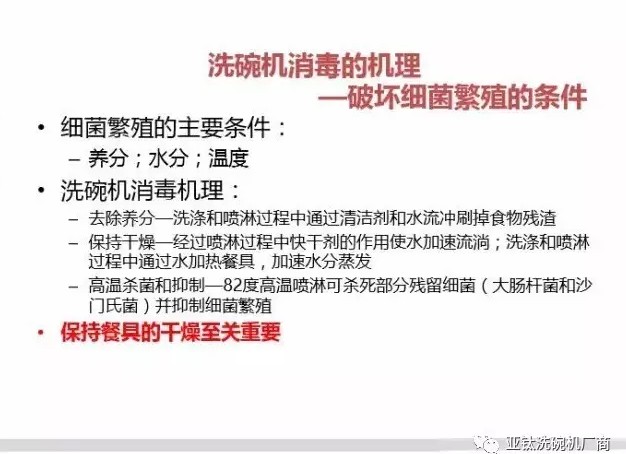 首先,洗碗機對于餐具的清潔程度是手洗所無法實現的。餐具衛生的一個重要環節即對餐具表面細菌的控制,細菌繁殖的條件一般包括營養、溫度、濕度、酸度、時間、氧氣等。