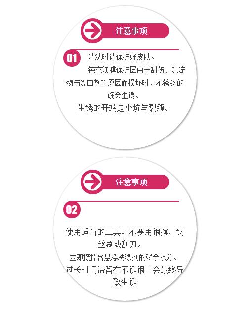 但是清洗不銹鋼表面的時候要注意:不銹鋼表面不能發生刮劃現象;不可使用含有漂白成分以及研磨劑的洗滌液,如果使用了洗滌液,必須在結束后使用干凈的水沖洗干凈。