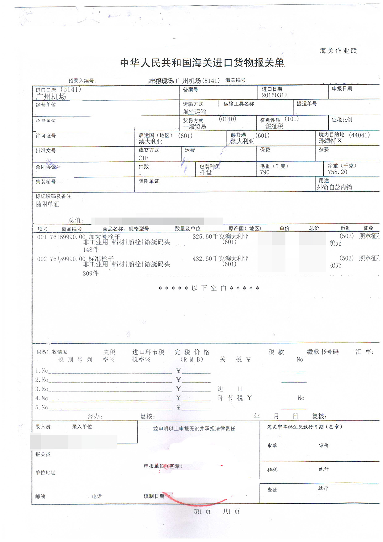進口日期:20150312客戶:珠海某游艇服務有限公司