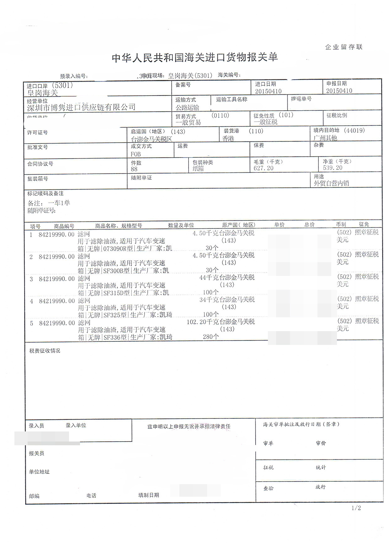 三、濾網進口報關案例展示