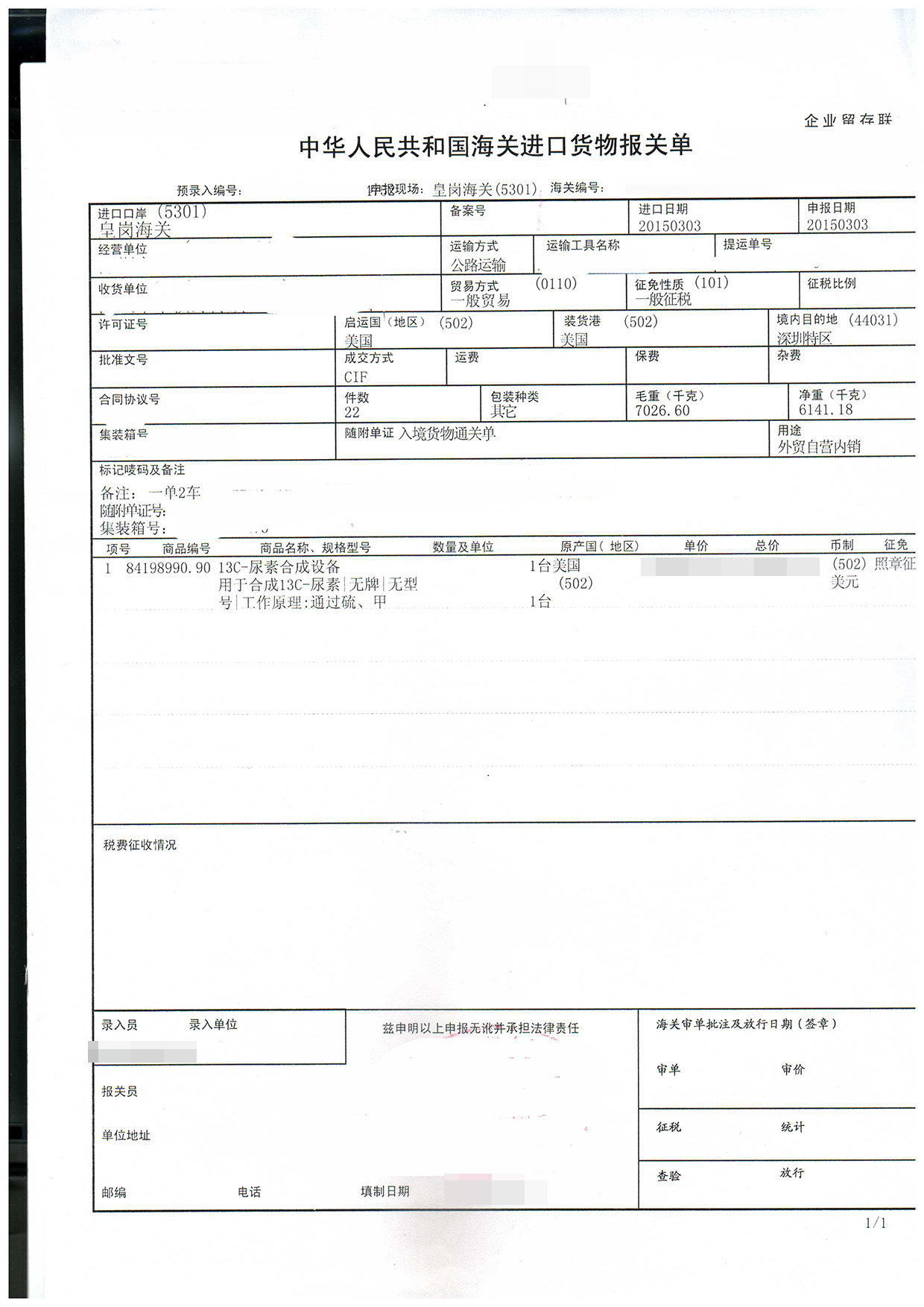 三、尿素合成設備進口報關案例展示